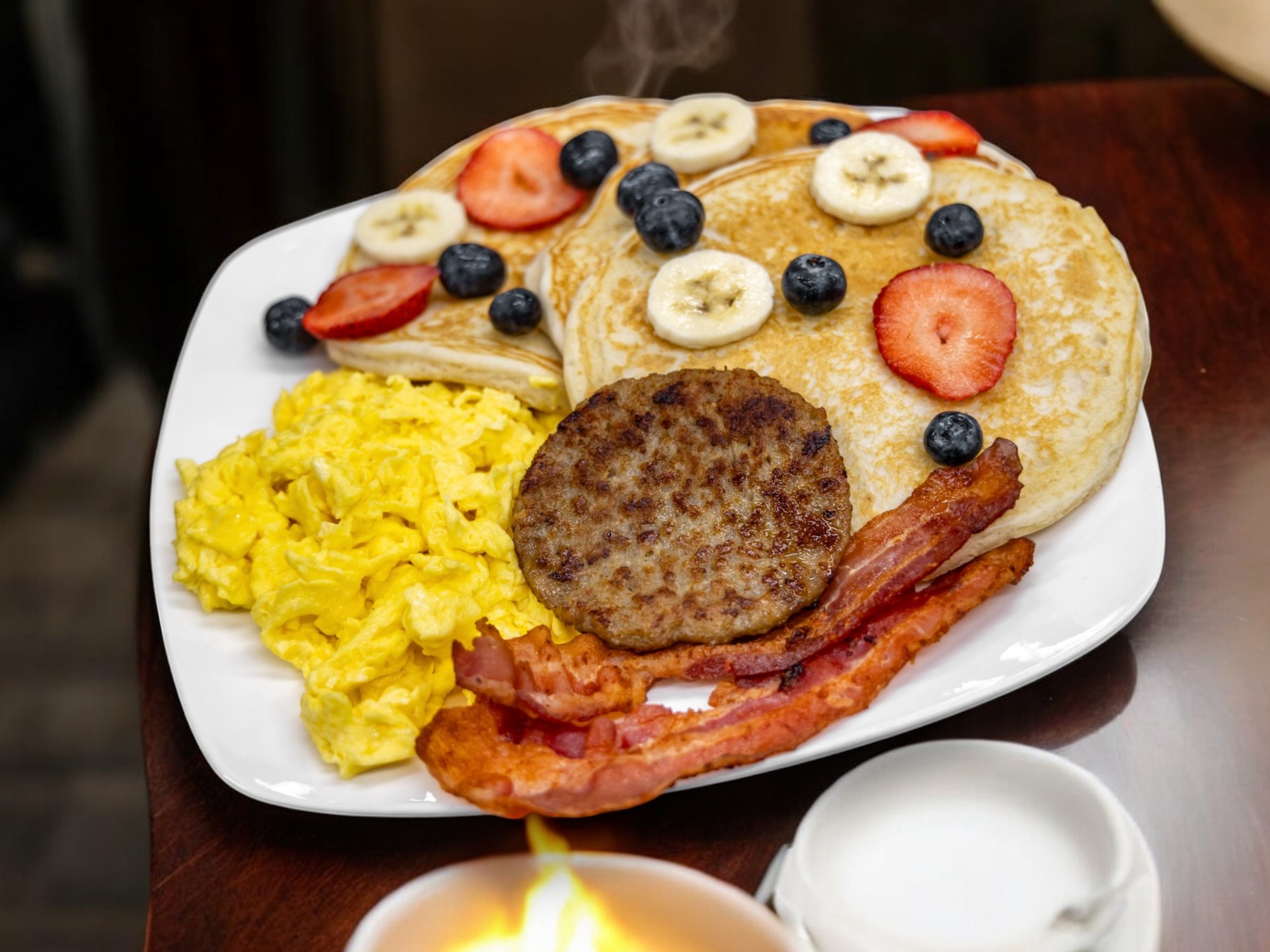 TWO FLUFFY PANCAKES, HOME FRIES, EGGS, AND CHOICE OF PROTEIN