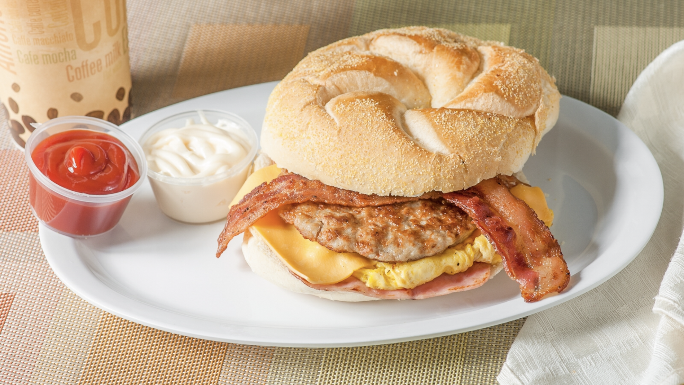 CRISPY BACON, SAUSAGE, HAM, MELTED AMERICAN, AND FLUFFY EGGS