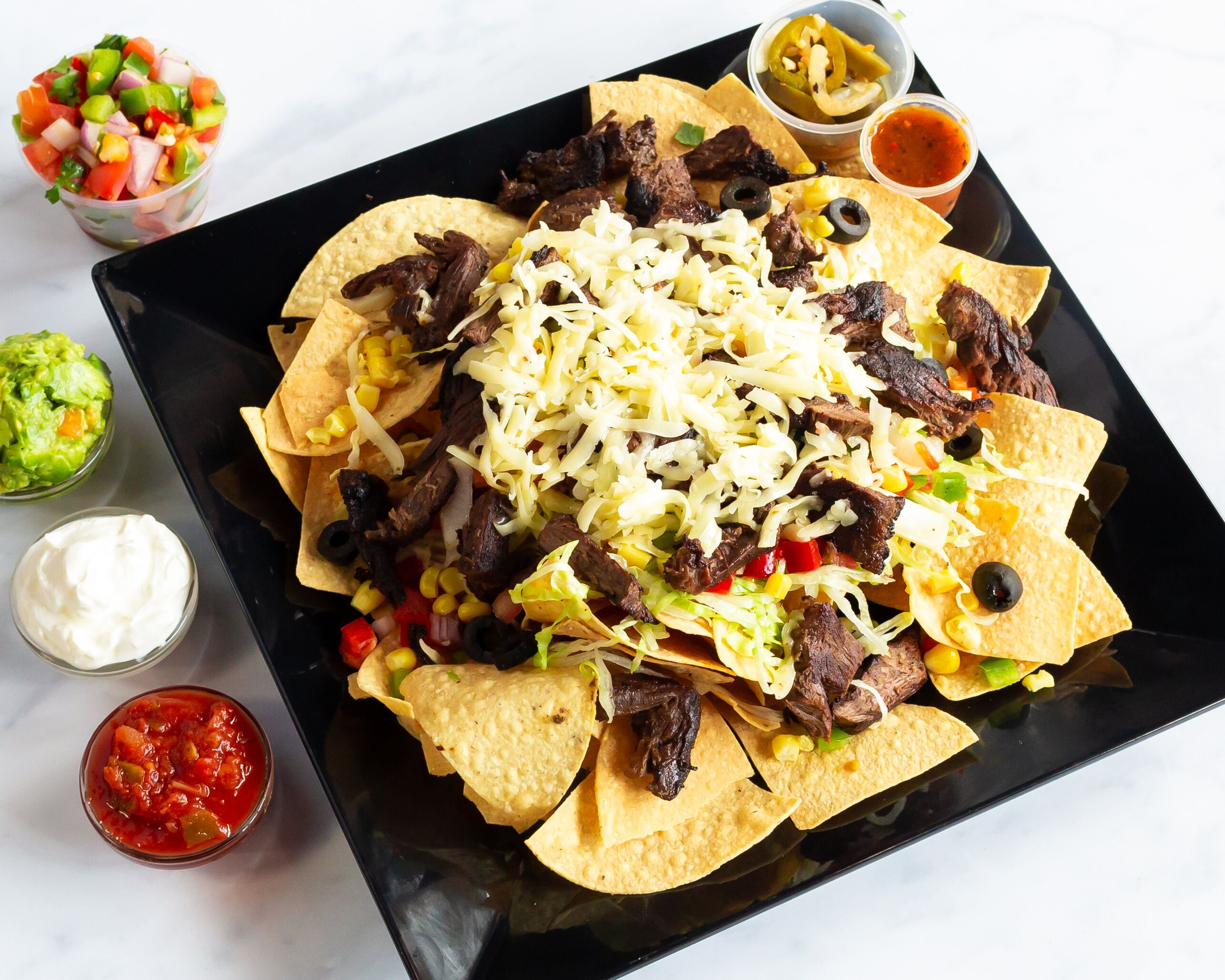 STEAK, PEPPER JACK, PICO DE GALLO, CORN, JALAPEÑOS, BEANS, SOUR CREAM